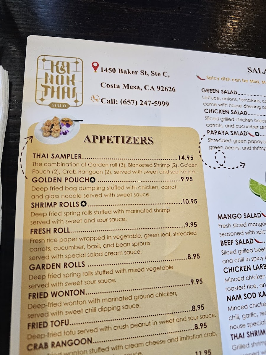 Mixed seafood, squids, shrimps, white fish, mussels, mints, onions, cilantro, tomatoes, seasoned with spicy Thai lime juice